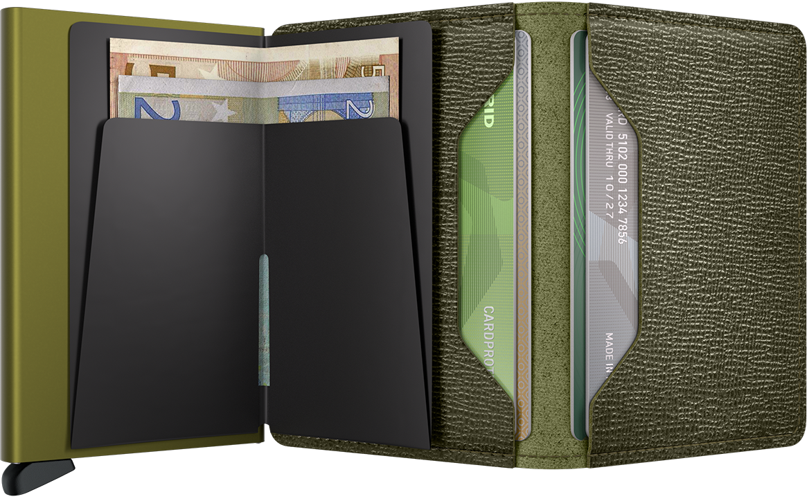 Its slim profile makes the Slimwallet fit perfectly into every pocket. The open exterior is cut extra wide to hold cards, banknotes and receipts.
