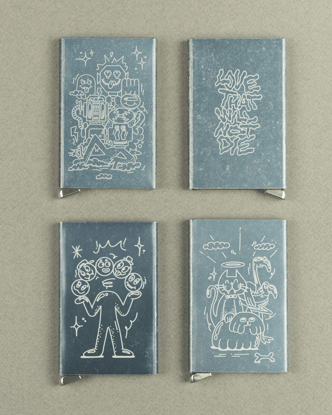 Secrid collaborates with artist Franky Sticks on a Limited Edition Cardprotector. The synergy of two creative hearts blossoms into three original art prints by the artist, engraved on 100 Stonewashed Cardprotectors. With this collaboration, Franky Sticks emphasises the guiding power of love towards a better future – ‘Love That Will Never Die’.