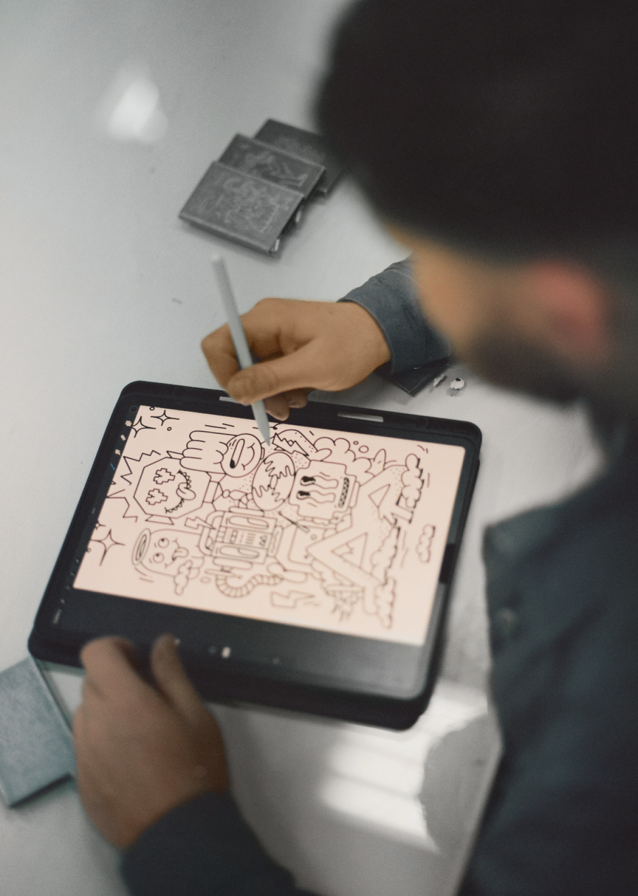 Franky Sticks is a Rotterdam based illustrator and deejay. His illustration style is defined by simple but strong flowing lines combined with a vivid color palette. His work can be seen from different angles and perspectives and is characterized by the adventures of funny little men, who function as a metaphor for modern society, or by his pure and aesthetic pop style that encourages a two-way conversation between the artist and viewer. There is a timeless quality to his playful yet contemplative work, which is inspired by Rotterdam’s diverse landscapes and thriving mix of cultures. Franky Sticks’ portfolio includes murals, digital illustrations, sculptures, paintings and limited art prints.