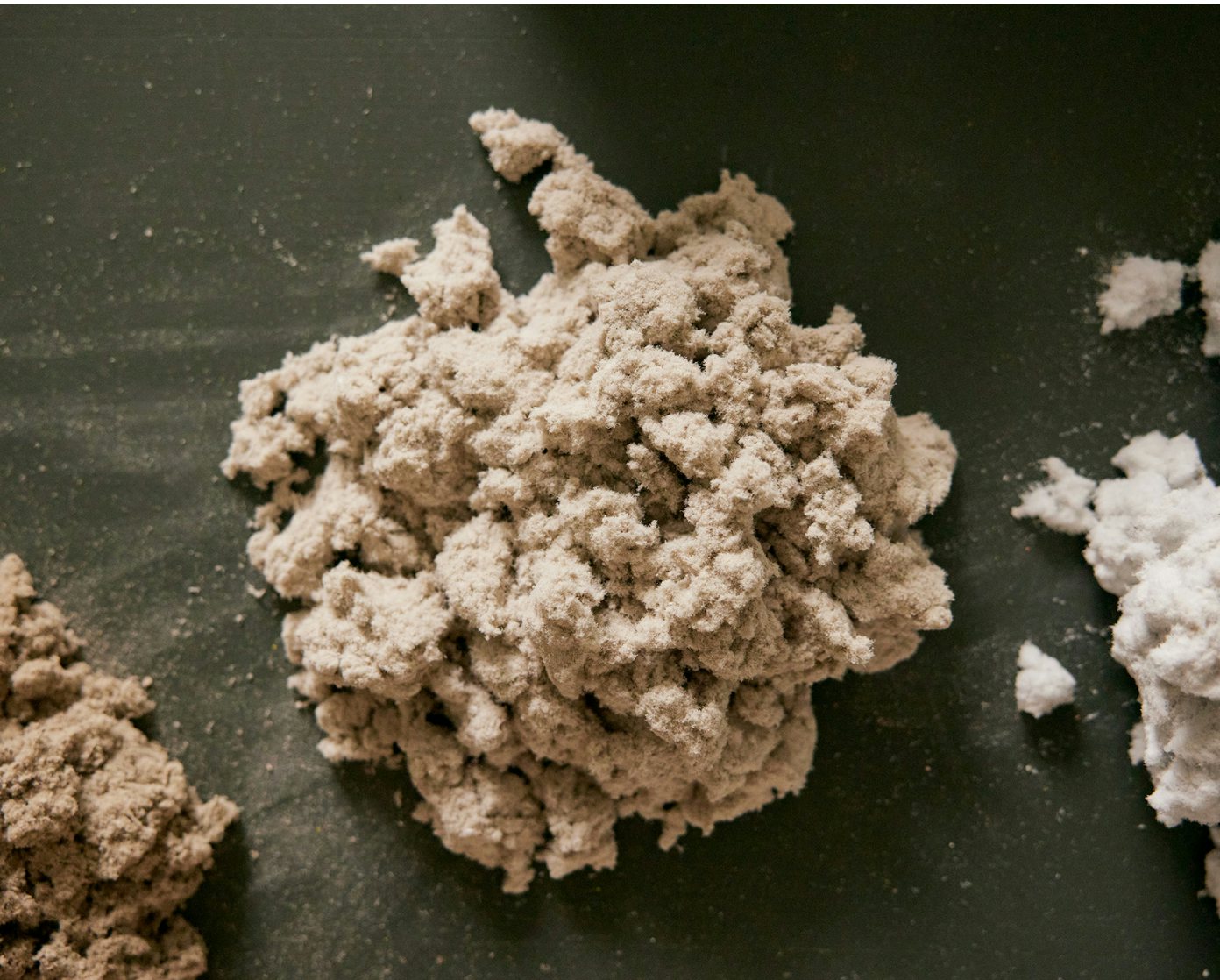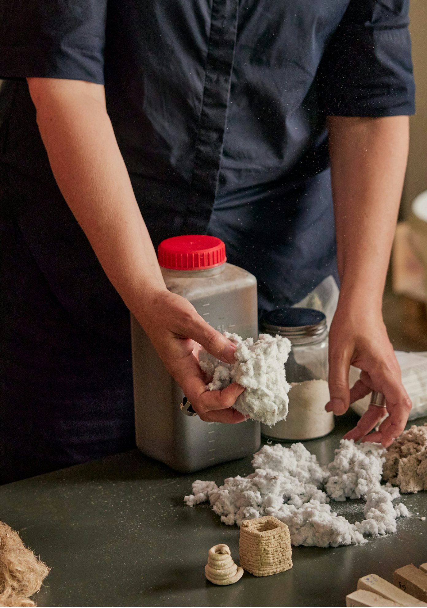 Huub: When we founded Omlab In 2019, we found that few materials were both 100% natural and circular. So we developed our own. Our material consists of ingredients such as lime, flushed and purified toilet paper from the sewage system and binders based on brown seaweed and Kaumera. This is a raw material from sewage treatment. Mixed, it resembles clay in structure and can be processed in different ways. We can 3D print it or press it into moulds. And when it hardens, it feels a bit like concrete.