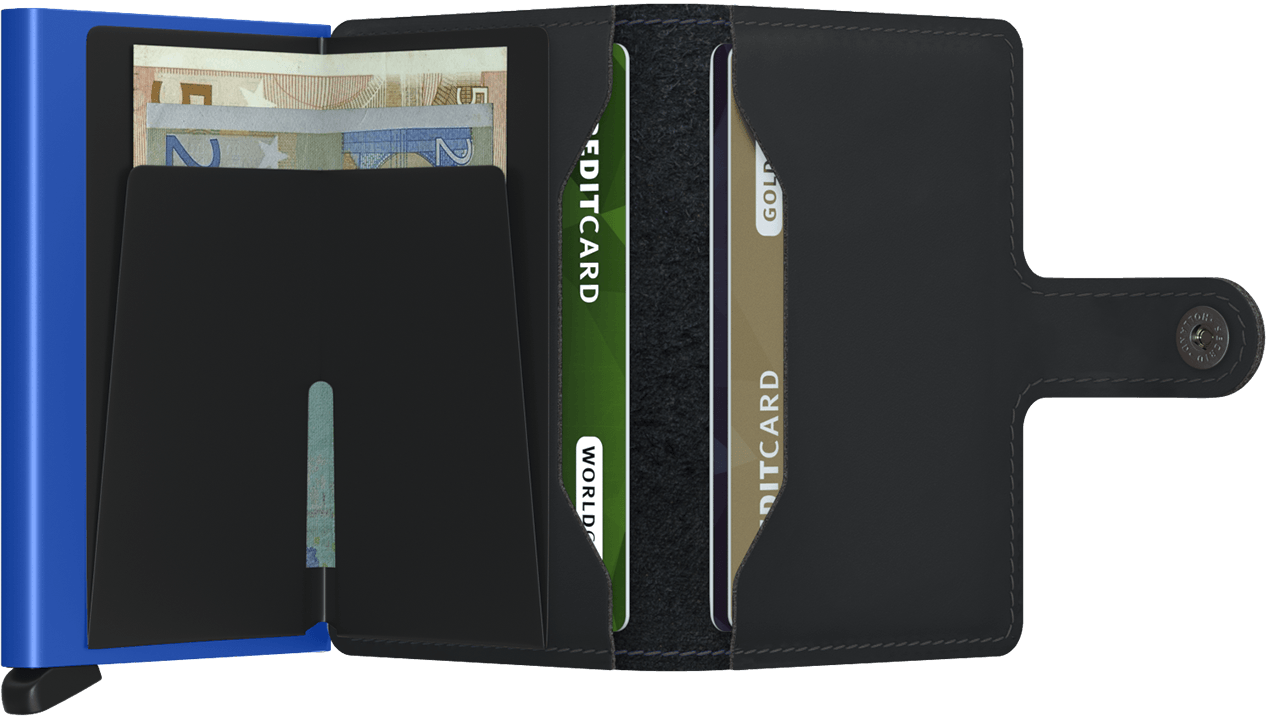 Small in size and surprisingly large in storage capacity, the Miniwallet combines the best of both worlds. The exterior holds banknotes, receipt and cards, while the aluminium Cardprotector allows you to slide out cards with one simple motion and protects them from bending, breaking and unwanted wireless communication.