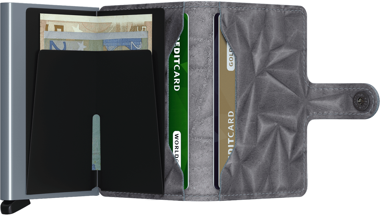 Small in size and surprisingly large in storage capacity, the Miniwallet combines the best of both worlds. The exterior holds banknotes, receipt and cards, while the aluminium Cardprotector allows you to slide out cards with one simple motion and protects them from bending, breaking and unwanted wireless communication.
