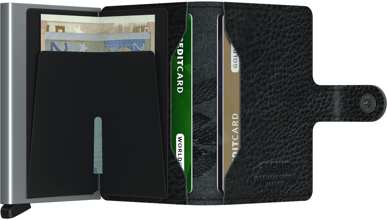 Small in size and surprisingly large in storage capacity, the Miniwallet combines the best of both worlds. The exterior holds banknotes, receipt and cards, while the aluminium Cardprotector allows you to slide out cards with one simple motion and protects them from bending, breaking and unwanted wireless communication.