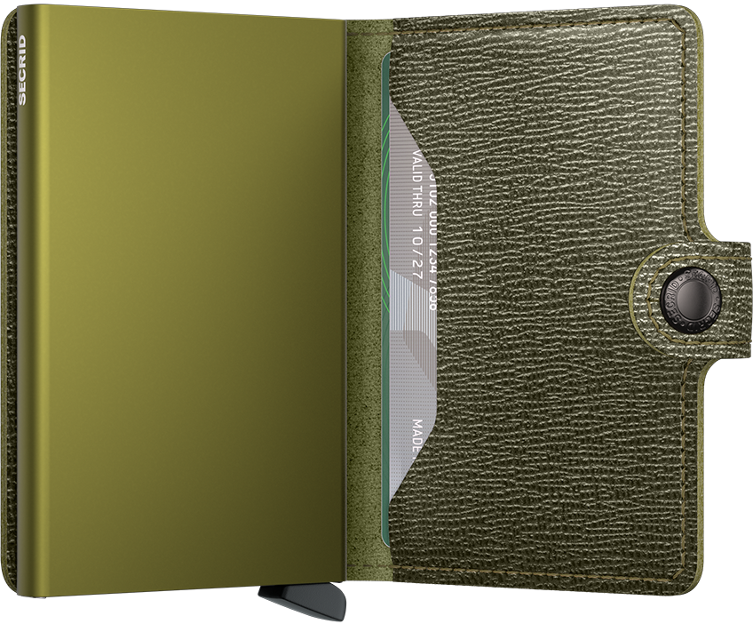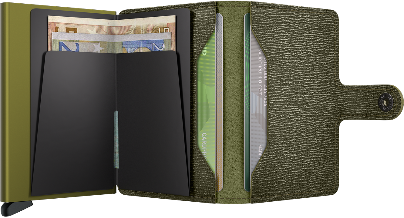 De tamaño pequeño pero con una capacidad sorprendentemente grande: la Miniwallet satisface todas las necesidades. La cubierta exterior puede contener billetes, tickets y tarjetas, mientras que el Cardprotector de aluminio permite extraer las tarjetas con un simple movimiento, evitando que se doblen, rompan o lean sin que nos demos cuenta.