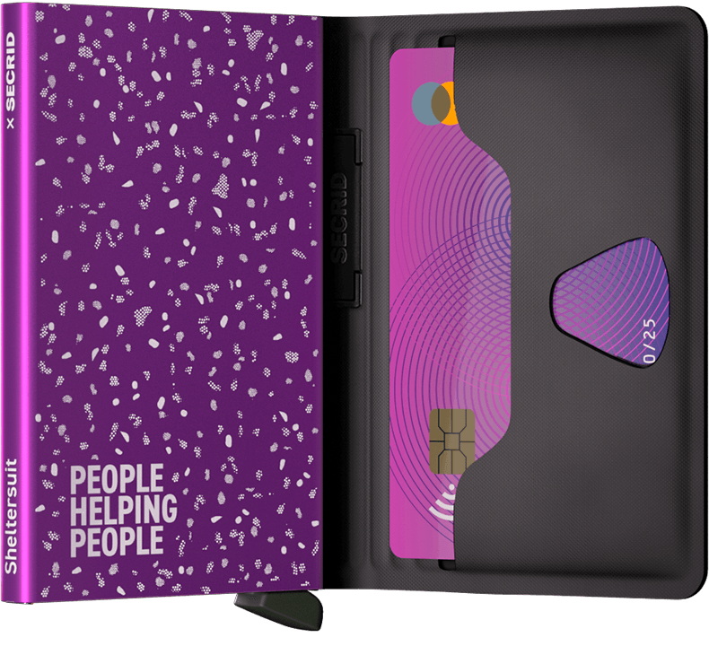 El Cardprotector de aluminio reciclado con un diseño inspirado en una baldosa de pavimento holandés, grabado con ell ema de la fundación Sheltersuit 'People Helping People', es el corazón de la bandwallet. Sirve como un recordatorio duradero para tomar medidas en favor de la gente sin hogar.