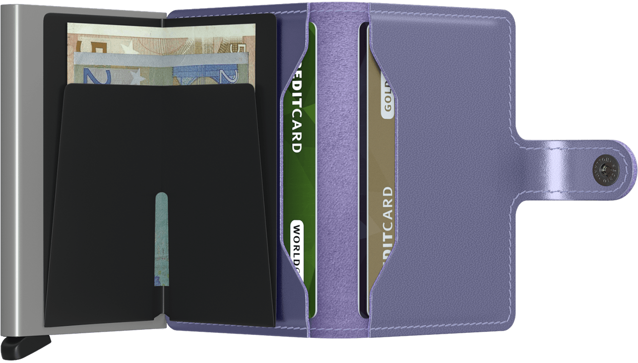 De tamaño pequeño pero con una capacidad sorprendentemente grande: la Miniwallet satisface todas las necesidades. La cubierta exterior puede contener billetes, tickets y tarjetas, mientras que el Cardprotector de aluminio permite extraer las tarjetas con un simple movimiento, evitando que se doblen, rompan o lean sin que nos demos cuenta.
