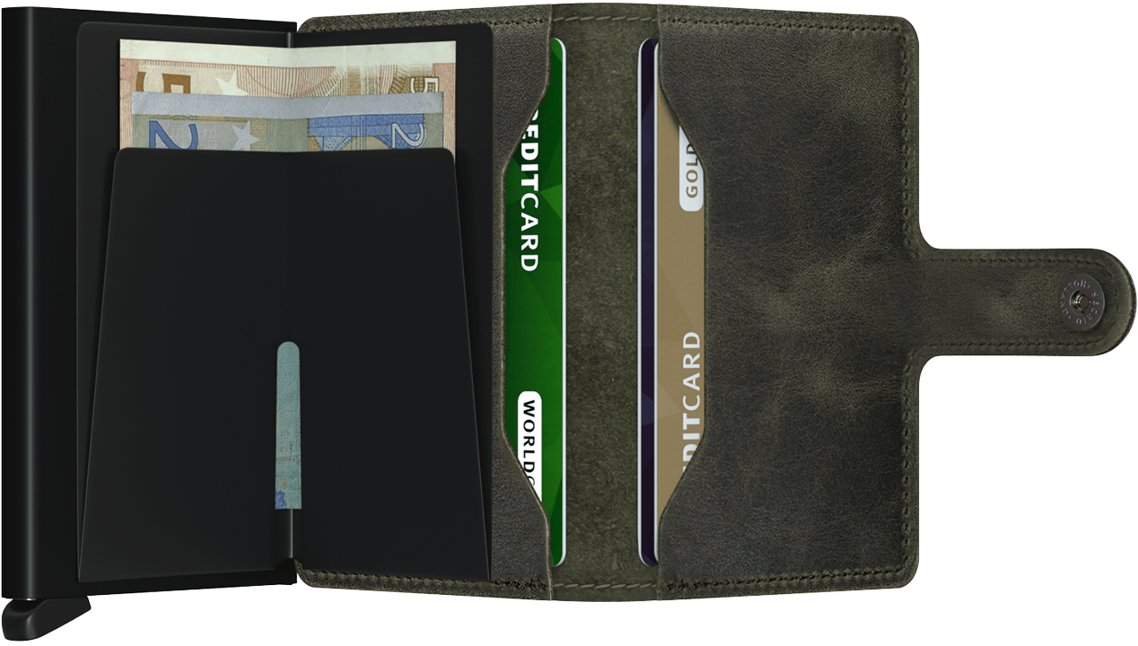 De tamaño pequeño pero con una capacidad sorprendentemente grande: la Miniwallet satisface todas las necesidades. La cubierta exterior puede contener billetes, tickets y tarjetas, mientras que el Cardprotector de aluminio permite extraer las tarjetas con un simple movimiento, evitando que se doblen, rompan o lean sin que nos demos cuenta.