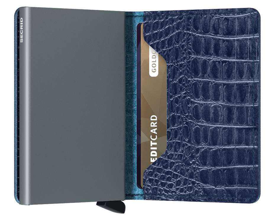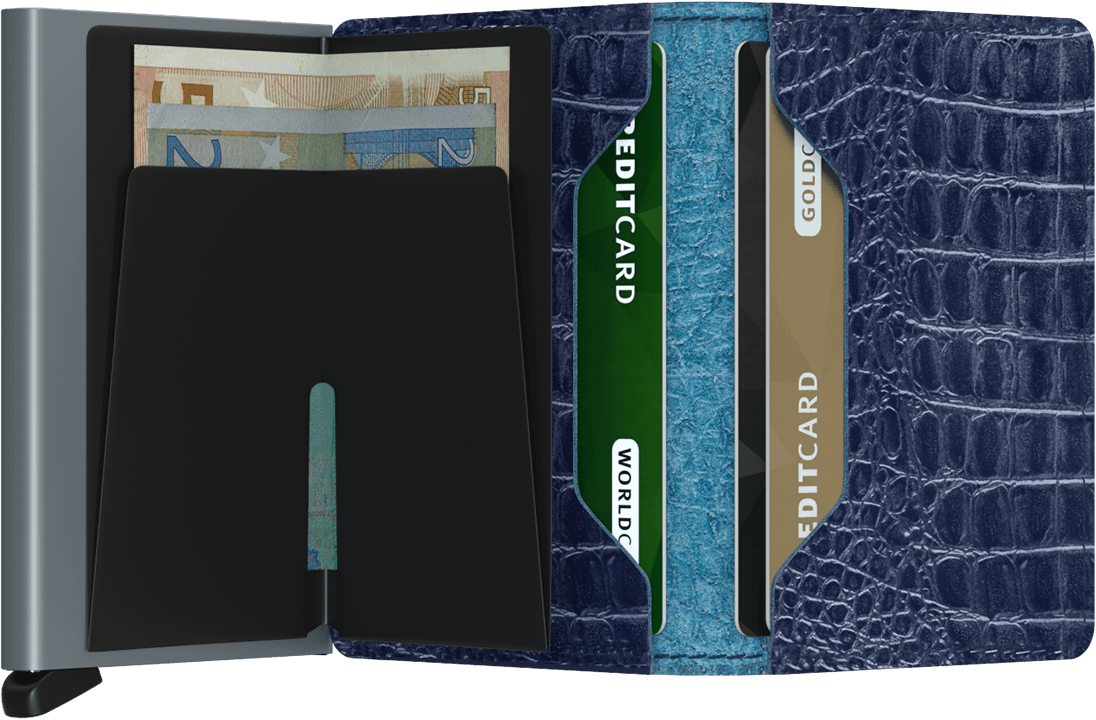 Su delgado perfil permite que la Slimwallet quepa perfectamente en cualquier bolsillo. El exterior abierto está diseñado de forma extra ancha para dar cabida a tarjetas, billetes y recibos. El mecanismo Cardprotector te permite sacar las tarjetas con un simple movimiento, mientras que la construcción de aluminio protege tus tarjetas de dobleces, roturas y comunicaciones inalámbricas no deseadas.