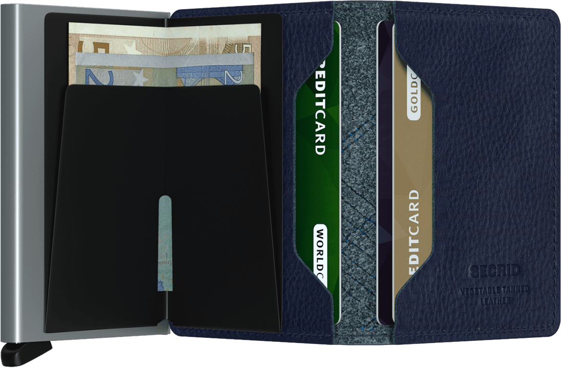 Gracias a su perfil delgado, la Slimwallet cabe perfectamente en todos los bolsillos. La cubierta exterior se corta con una longitud más larga para crear más espacio para tarjetas, billetes y tickets.
